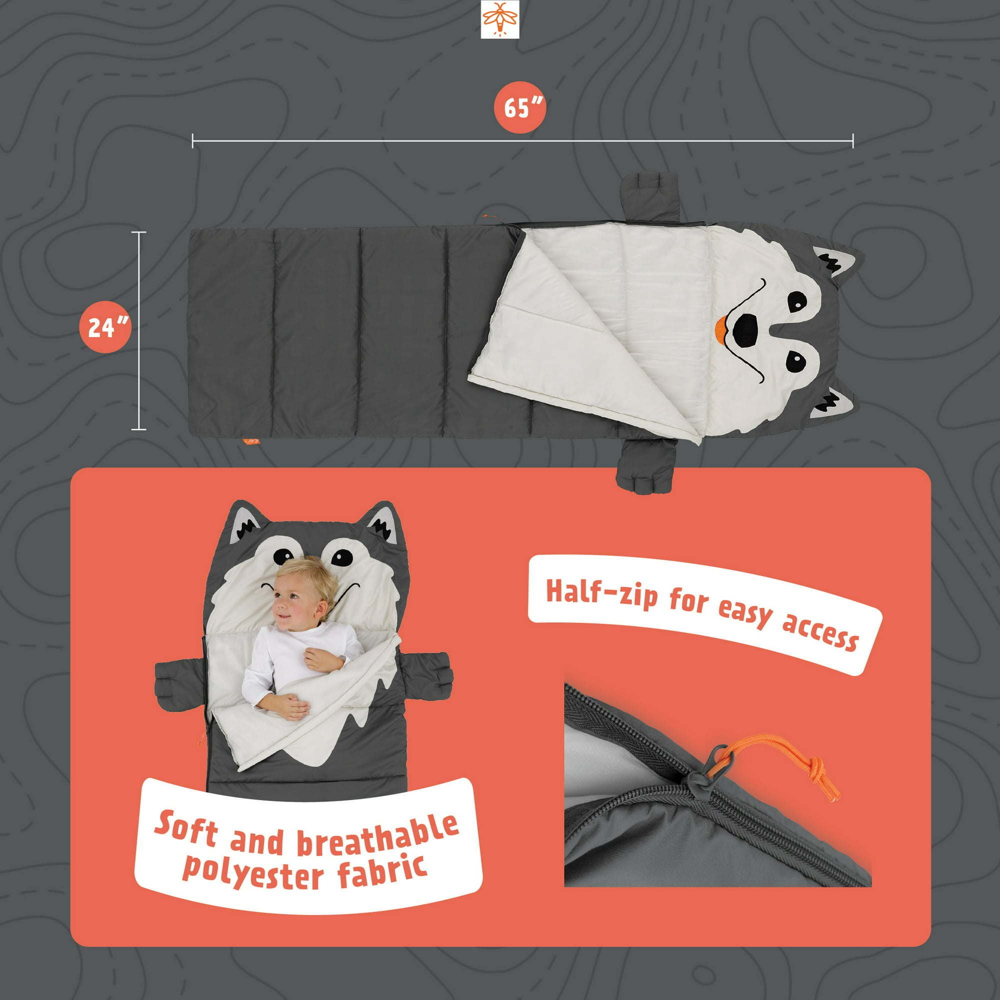 Aspen the Wolf Kid's 3 Piece Camping Combo Set:Includes duffel bag, sleeping bag, and lantern, which is perfect for any indoor sleepover or outdoor campoutThe duffel bag has convenient exterior pockets and it is the perfect size for sleepoversThe sleeping bag is half-zip for easy access into and out of the sleeping bag and is rated for warm weather campingThe sleeping bag is machine washable and includes its own carry bagThe lantern has six colorful light modes for any situation and has an integrated hanging hook on the bottom for easy carryingDuffel Bag: 17.5" x 7.5" x 9.1"Sleeping Bag: 65" x 24"Lantern: 4.5" x 4.7" x 6.3"Model number: 30890